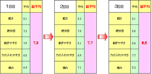 さらに、トリートメント直後の変化を「軽さ」「疲労感」「動かしやすさ」「力の入れやすさ」「痛み」の5項目について選手に話を聞き、11段階で評価し、症状が悪化した場合を0、症状に何も変化がない場合を5、症状が改善された場合を10として、その評価を表に表しました。